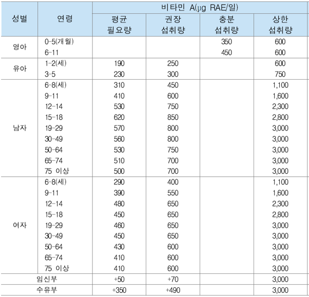 • ⚠️ 상한섭취량: 3000 µgRAE/일